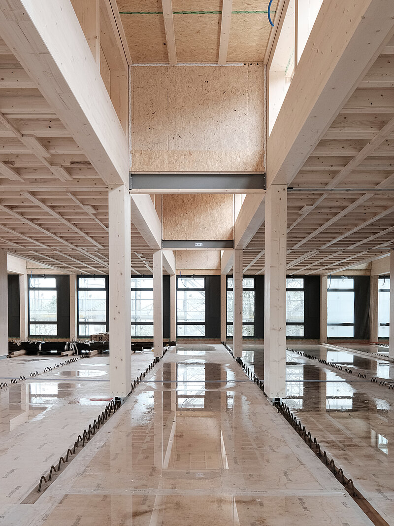 Während der Holzbau des Schultraktes bereits fertig aufgerichtet ist, werden über der Sporthalle derzeit noch die letzten Dachträger versetzt. Schon jetzt zeigt sich die schöne Lichtstimmung in der zukünftigen Lernlandschaft. Quer zum Gebäude verlaufende Oberlichter bringen Nordlicht in die Tiefe der Räume.