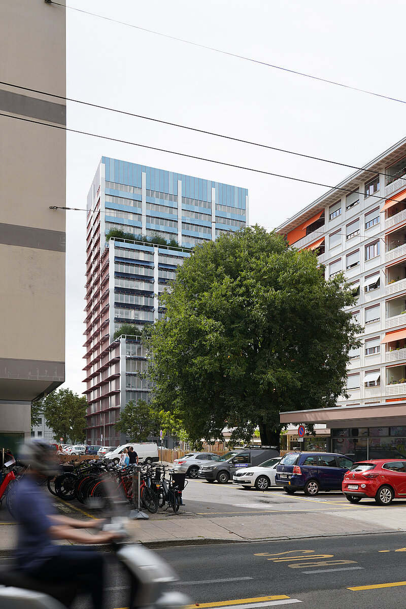 Das neue Centre des Sciences generiert dank seinem geringen Fussabdruck viel Freiraum und eine hohe Durchlässigkeit an der wichtigen Schnittstelle von Stadt und Fluss. Mit einer hohen, repräsentativen Hauptfassade richtet sich der Bau zur Arve aus, während er auf der Stadtseite bis zur Traufhöhe der Nachbarbauten abgetreppt ist. Ein Atrium verbindet die verschiedenen Bereiche und verjüngt sich, korrespondierend zur äusseren Form, stufenweise nach oben.
